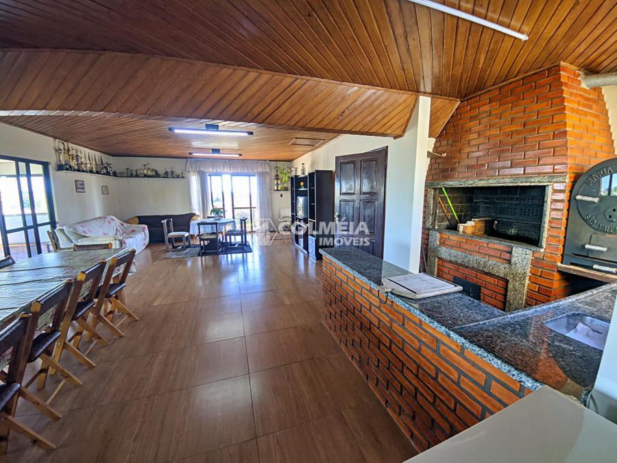 Amplo salão de festas com churrasqueira e forno no prédio.